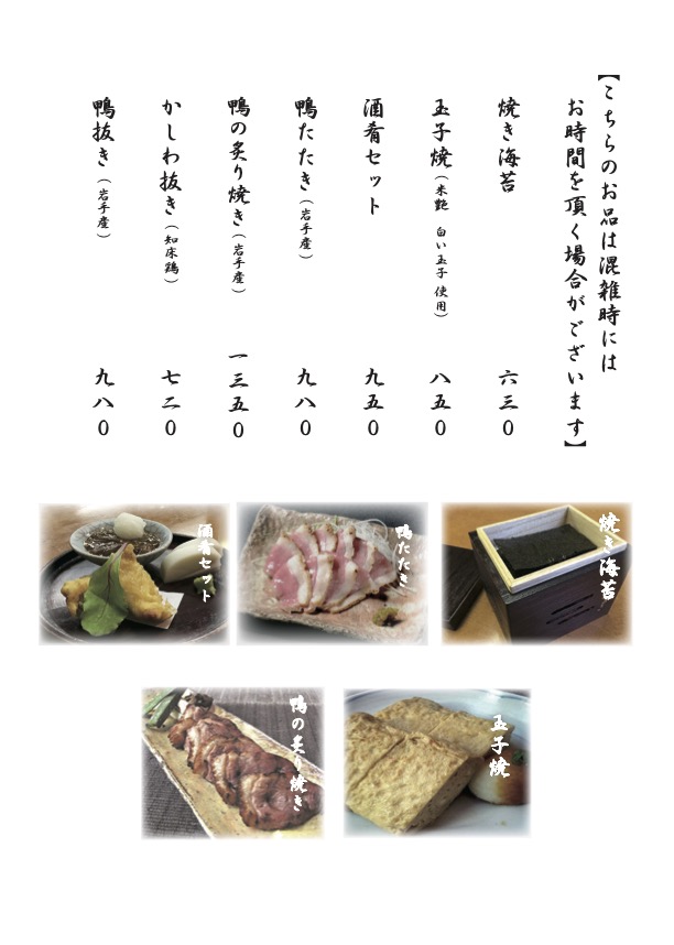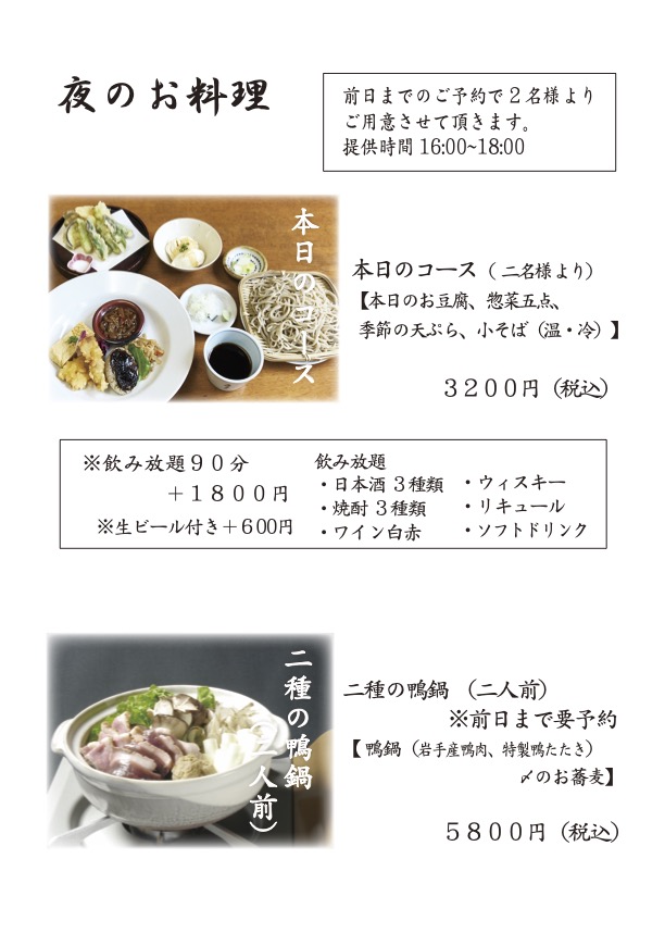 まるきでは北海道雨竜郡北竜町の「きたわせ種」を使用し二八にて毎日丁寧に打ち上げ、 コシと香りを楽しんでいただけるよう、お客様のご注文をいただいてから湯がきます。 季節ごとに変わる季節のそばをはじめ、まるきならではのお蕎麦やお料理をぜひお楽しみください。
