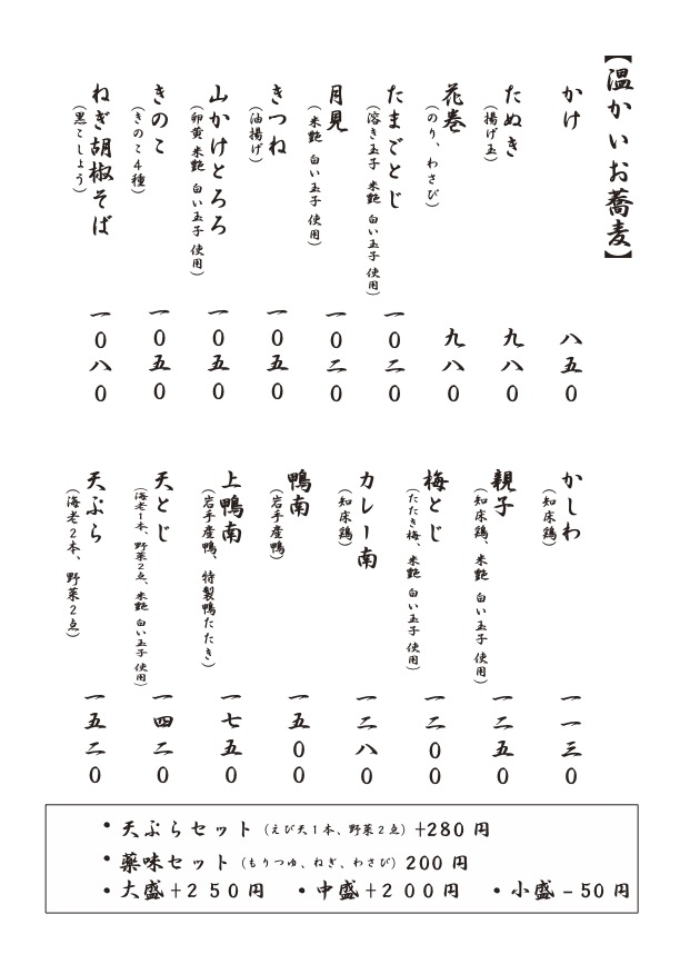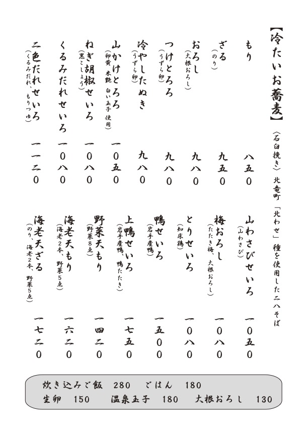 まるきでは北海道雨竜郡北竜町の「きたわせ種」を使用し二八にて毎日丁寧に打ち上げ、 コシと香りを楽しんでいただけるよう、お客様のご注文をいただいてから湯がきます。 季節ごとに変わる季節のそばをはじめ、まるきならではのお蕎麦やお料理をぜひお楽しみください。